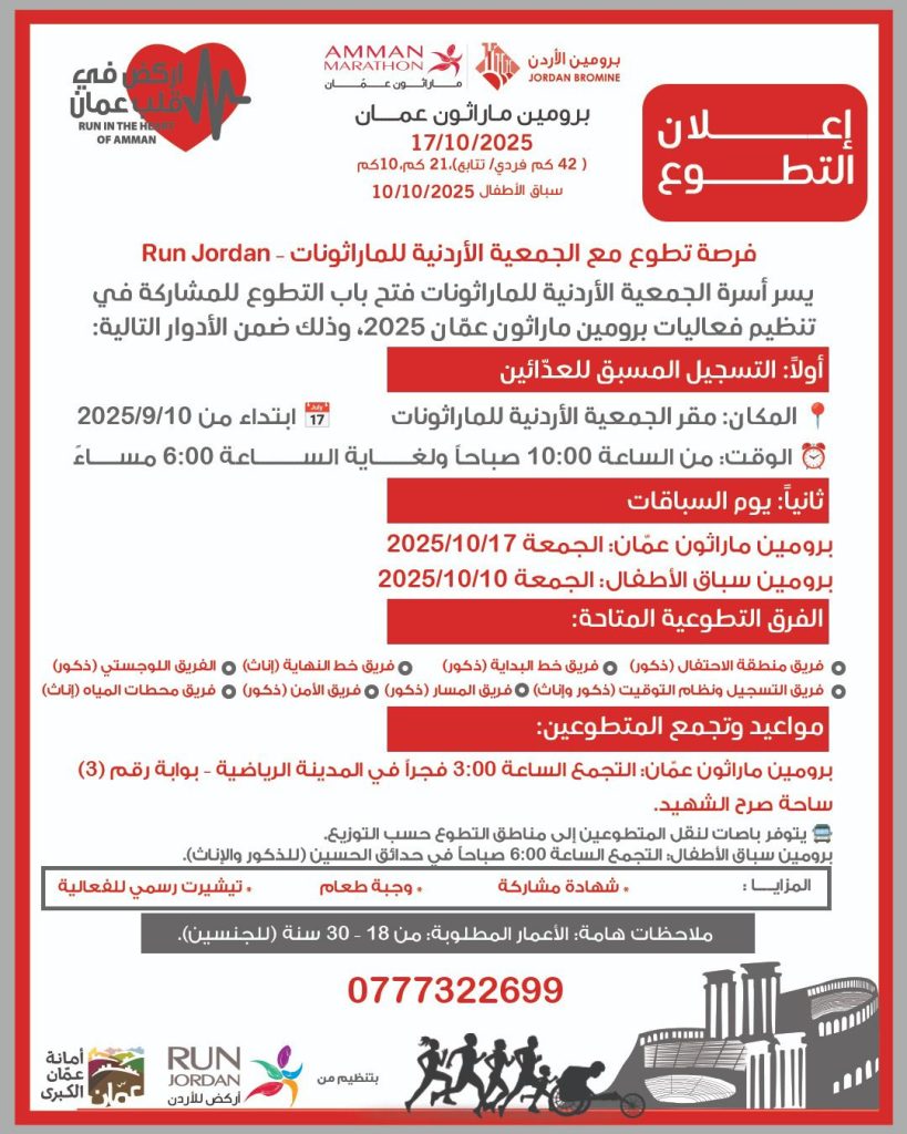 يسر أسرة الجمعية الأردنية للماراثونات فتح باب التطوع للمشاركة في تنظيم فعاليات برومين ماراثون عمّان 2025.
